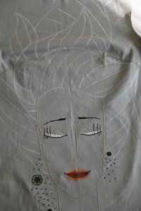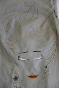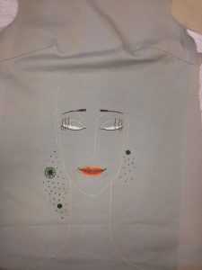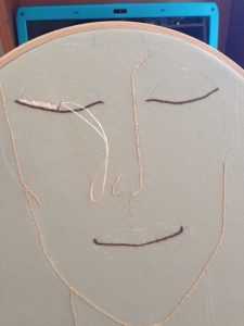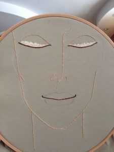 Кроме всего перечисленного, нужно заранее определить для себя технику вышивания. Чтобы оформить это платье, будет использована техника французского узелка, глади с тамбурным швом. Вставьте материю в пяльцы и начинайте вышивать очертания лица, используя тамбурный шов. Затем проделайте тоже самое с бровями, глазами и ртом, как показано на фото. Гладью вышейте тени на глазах девушки.