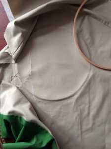 После этого следует проклеить с помощью флизелина ту часть любимого изделия, которое будет декорироваться вышивкой. Стоит обратить внимание на тот момент, что флизелин необходимо взять немного большего размера, чем сама вышивка. Если этого не сделать, то ваша материя может потом немного потянуться, а сам узор будет выглядеть не красиво и немного криво.