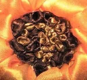 Сердцевину цветка следует оформить несколькими оттенками коричневого цвета. Это может быть светлый и темный тон. Вставьте ленточку в иголку и начинайте делать короткие стежки так, чтобы получались петельки. После того, как вы сделаете один стежок, выполните петлю с изнанки. Вам каждый раз проводить такие манипуляции, чтобы сердцевина получилась такой, как нужно. На фото можно посмотреть, как выглядит готовый образец.
