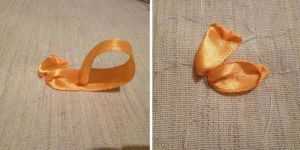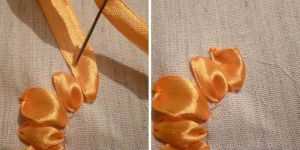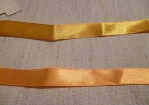 Для работы приготовьте две атласные ленточки разного оттенка желтого цвета, как показано на фото. А также иголку с широким ушком и нитки в тон ленточкам.