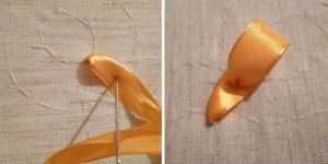 Проколите ленту не обязательно по центру, можете это сделать даже возле краешка. Чем ближе вы осуществите прокалывание к краю, тем больше он сможет завернуться в сторону. Заверните стежок в другую сторону. Выводите атлас на лицевую часть полотна, затем сложите, и проткните сквозь центр с протягиванием через материю.