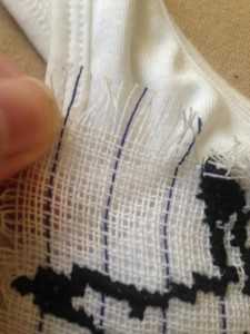 Подготовив все необходимые материалы, возьмите накладную канву и отрежьте ее в нужном вам количестве, после чего приметайте к футболке. Вышивку с помощью такого материала проводить очень удобно, так как по окончанию процесса работы, с легкостью можно удалить канву. Аккуратно выдернув нити. Наметанная канва также дополнительно фиксируется крахмалом по границам, это поможет ткани вплотную соединиться с ней. Определите центр вышивки и можно приступать к процессу.