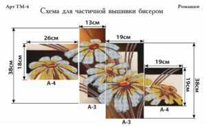 Для вышивальщиц со стажем можем посоветовать обратиться к уникальным схемам с изображением ромашек, которые складываются из нескольких составных частей и представляют собой так называемые разрозненные картины, которых объединяет один сюжет. Подобного рода изделие называют триптихом (состоит из трех полотен) или полиптихом (четыре и более полотна). Это довольно объемная работа, которая отнимет у вас немало времени, но в результате собрав все детали в единый сюжет – вы получите оригинальный предмет для декора домашнего интерьера.