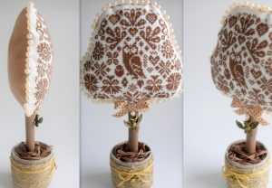Набитое синтепоном изделие не нужно зашивать со всех сторон. Оставьте не тронутое место в самом низу заготовки, так как в это отверстие необходимо будет вставить деревянную подставку покрытую лаком. Затем разведите гипсовый раствор и залейте его в приготовленную емкость. Поставьте туда дерево счастья и придержите его руками, пока гипс не начнет засыхать. Многие мастерицы помимо бусин и бисерин, украшают оберег различными подвесками с бантами.