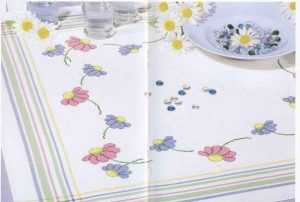 Следующая композиция представлена ромашками, которые можно вышить крестиком в любой стороне текстильного изделия. Их можно расположить в центре полотна или по краям. Примените свою фантазию и навыки, чтобы получить идеальное изделие для своего дома. Так как эти полевые цветы имеют лепесточки белого цвета, в работе есть возможность использовать канву разного цвета. В любом случае она будет совершенно актуальной. На темном фоне такие растение приобретет совершенно стильный вид, который используется именитыми дизайнерами.