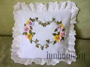Умелые рукодельницы любят окружать себя красивыми изделиями в повседневной жизни. Это могут быть вышитые нитками вещи или же сплетенные из бисера поделки. Но больше всего им нравится дополнять свой домашний интерьер, например вышитыми диванными подушками. В этой статье речь пойдет о вышивке атласными лентами. Вы узнаете, как можно оформить декоративную подушечку красивыми анютиными глазками из лент.
