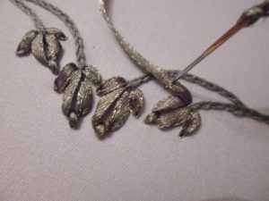 Возле каждого цветочка должно быть расположено по три листика, как на фото. На ленте каждого листика нужно сделать по три стежка, по форме который будет напоминать куриную лапку. Чтобы украсить такую композицию, можно вышить своими руками на кончиках веточек по маленькой шишке хмеля. Сделайте по серединке одиночную петельку, а по краям сформируйте прямые стежки, как показано на фото.