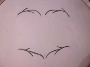 Первое, что нужно сделать – это вышить нитками веточки в таком расположении, как это показано на фото. Вставьте ткань в пяльцы, затем нанесите простым карандашом пунктир ровной полосой, и начинайте вышивание веточек в технике петельного шва.