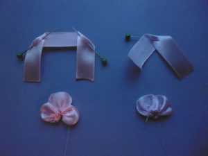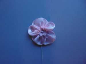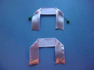 Кончики атласа опалите огнем, чтобы нитки не осыпались. Нижняя часть бутона будет вышиваться лентой протяженностью семь сантиметров. Сложите ее пополам, сделав прямой угол и зафиксируйте иголочками. Потом выполните наметочный шов от одного уголка диагонально к другому. Затем по краям основного материала и опять диагонально, только ко второму уголку. Десяти сантиметровый отрез сложите так: поделите его условно на 3 части, потом следует загнуть кончики, делая прямой угол вниз, и зафиксировав иголочками. Прошейте от уголка диагонально до конца ленточки, а затем по краям всего материала до следующего уголка, также диагонально.