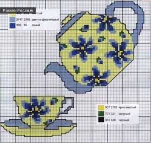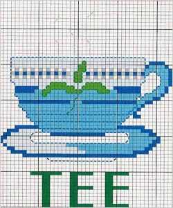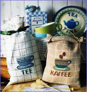Не менее распространенным и востребованным на кухне является изображение чашки кофе или чая. Их можно вышить на соответствующих мешочках для хранения таких продуктов, как показано на представленном в статье фото.