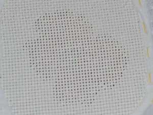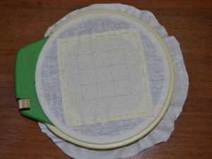 Пяльцы обязательно вам понадобятся, если вы считаете себя новичком в такой вышивке. В любом случае с ними работать намного удобнее, так как ткань не будет в ваших руках скатываться и скручиваться, а бисер не будет налаживаться друг на друга. После того, как вы вставили канву, вам нужно расчертить ее на клеточки, размером 10 на 10. По краям нужно оставить запас ткани и наложить канву на бязевый отрезок, который потом пришейте, как показано на фото.