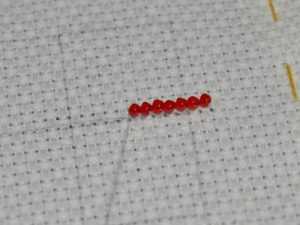 Отматывайте мононитку, только не слишком много, чтобы она не путалась в ваших руках во время вышивания. Вставляйте ее в иглу и крепите с помощью узелка с изнанки полотна. После этого стоит подумать над тем и решить, в каком направлении вы будете вышивать стежки с бисеринами, так как это очень важно. Можно сказать буквально, что от этого зависит, как будет выглядеть ваше изделие. Начинайте делать работу с центра цветка, по направлению вверх, а затем опускайтесь вниз. Чтобы закрепить пройденный ряд, вам нужно дважды прошить первую и последнюю стекляшку.
