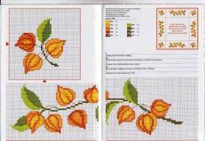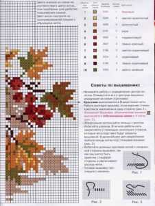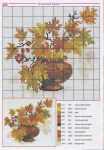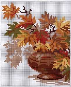 Для новичков на просторах интернета можно также найти огромное количество подходящих схем, которые они смогут с легкостью вышить крестиком. Давайте подробнее их рассмотрим. Если хотите поселить у себя в доме все краски осени, тогда такой рисунок, как ветки с листвой в вазе вам подойдет больше всего. Обратите внимание на то, что в нем задействованы только одиннадцать оттенков ниток мулине, а это намного упростит вам работу.