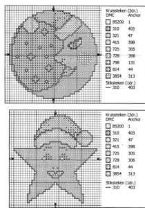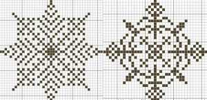 Снежинки – это пожалуй самое простое, что можно вышить в технике креста. Тем не менее это праздничное и зимнее изображение является одним из самых популярных среди рукодельниц, которые еще не успели достигнуть больших вершин в таком мастерстве. Для работы понадобится всего лишь один цвет. Это может быть белый или голубой, то есть классический для снежинок. Такой рисунок не займет много места, так как имеет размер тридцать два крестика по вертикали и столько же по горизонтали. Рисунок можно вышить, как по центру изделия, так и по сторонам в хаотическом движении. Если такой рисунок покажется вам немного скучным и однообразным, смело можете его украсить пайетками и переливающимися бисеринами.