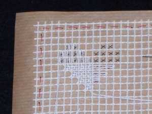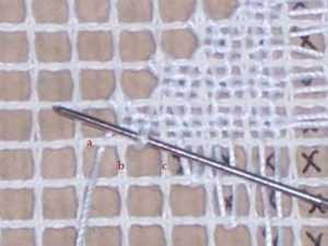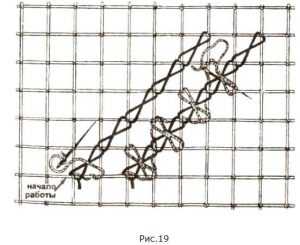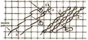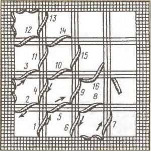 Данный узор необходимо вышивать не только горизонтально, но и вертикально. Заполнение горизонтальных рядов должно происходить сверху вниз, с переплетением вертикальных. Если у вас закончилась нитка, тогда протяните ее по краю сделанной ячейки, а потом вставьте новую, и продолжайте рукоделие.