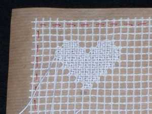 Обрежьте по размеру, который вам необходим, готовую сеточку. Для этого примера, который будет описан в статье, понадобится моток размером 16 на 14 клеток. На фото изображена вышивка сердца, которая будет по размеру значительно меньше, но вы должны в любом случае оставить с каждой стороны полотна по несколько клеток, чтобы была возможность прикрепить сеточку к рамке.
