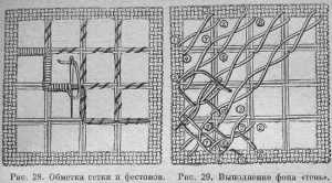 Вышивание должно происходить по крепко натянутой и прикрепленной сеточке. Если этого не сделать, то рисунок может деформироваться. Для большего удобства, крепление можно сделать с помощью строительного скотча. Пришивают изделие, используя сметочный стежок или шов «назад иголка». Главное условие в работе – сетка не должна вытягиваться. Если полотно выполнено слишком мягкой нитью, для придания ей правильной формы, опытные вышивальщицы окунают изделие в разведенный с водой желатин, а потом расправляют полотно на ровной поверхности и ожидают, когда материя подсохнет. Высохшая ткань будет жесткой, то есть такой, как надо для работы.