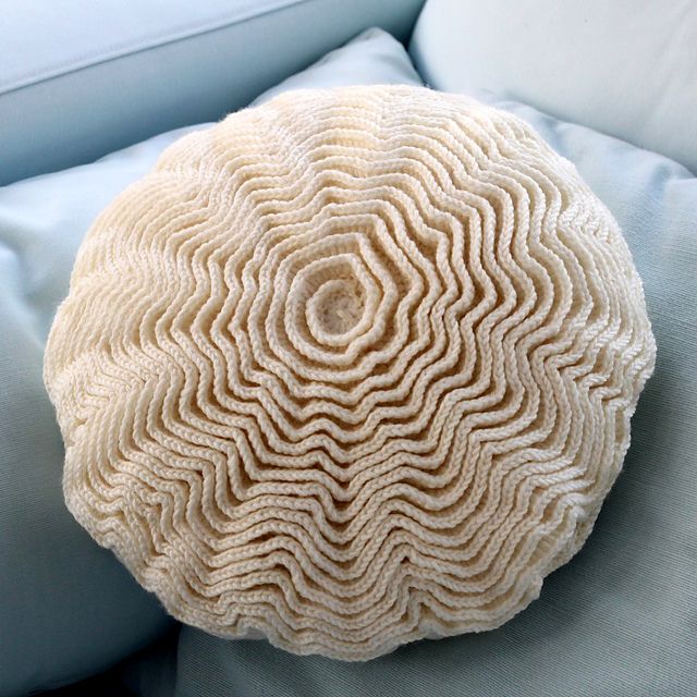Предлагаем вам вязание оригинальной диванной подушечки от Tracie Barrett. Выполняется она простыми полустолбиками по спирали, при этом рюши провязываются только на лицевой стороне работы вдоль рядка с полустолбиками.