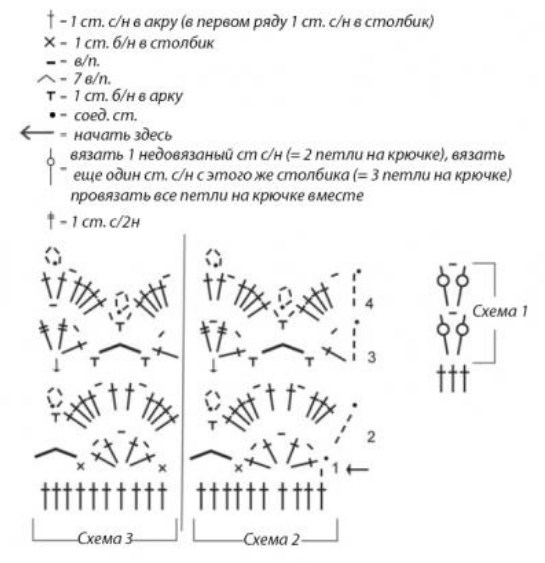 Вязальные узоры выполняем согласно схем 1, 2 и 3.