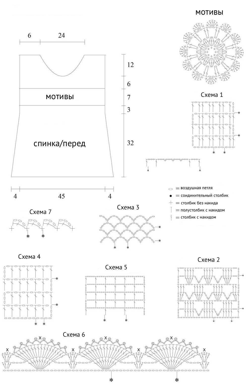 Сшиваем стороны под проймочками на 1 см, сшиваем плечи. обвязываем проймы по схеме 7, а горловину – 1 р. с. без н., 1 р. с. с н. и 1 р. с. без н. Вот и все, топик связан!