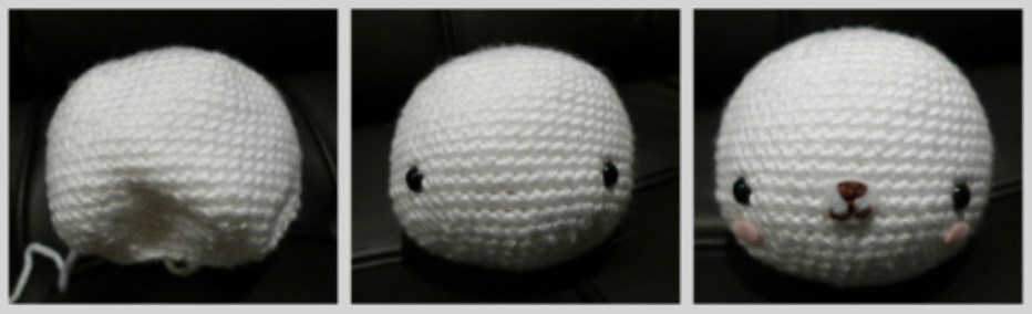 Завершаем работу, приклеиваем белый кружок, нашиваем на нем носик, приклеиваем два маленьких овала розового цвета для щечек.