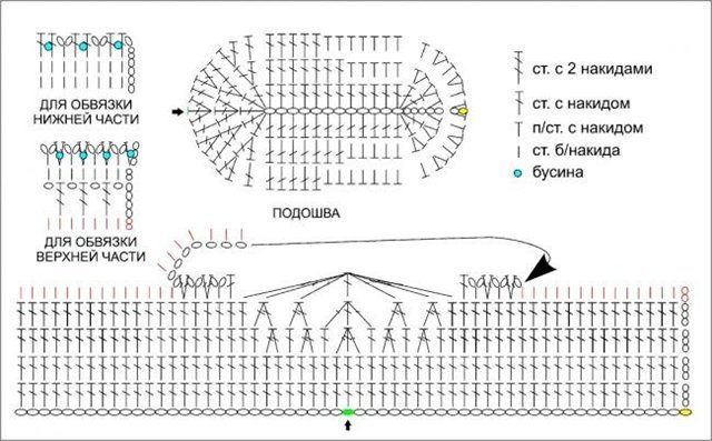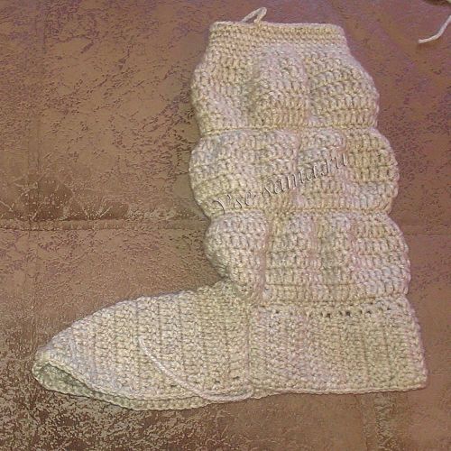 По желанию, вязаные сапоги можно декорировать бусинами или бисером. Чтобы обувь хорошо прилегала к ножке шнурок-гусеничку или просто цепочку из ВП и 2 р. СБН.