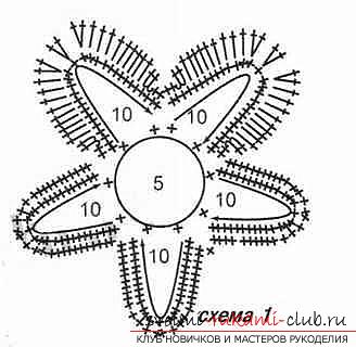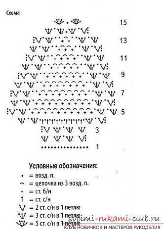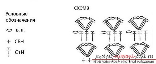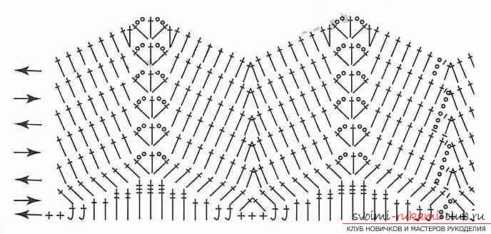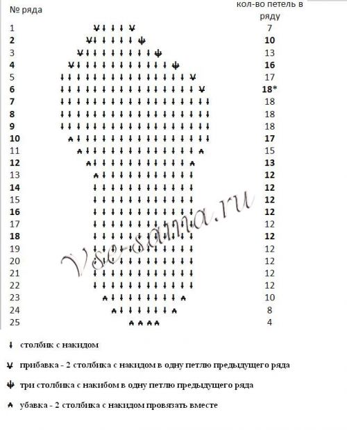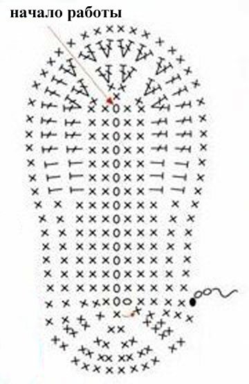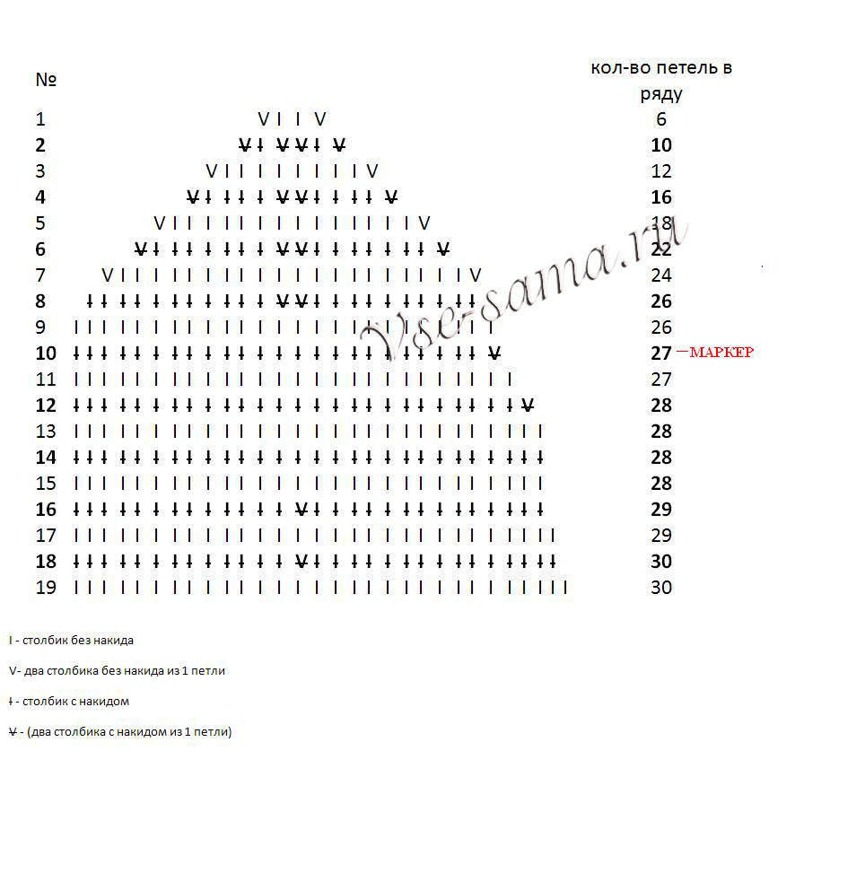 Набираем 5 ВП в начале чётного ряда, затем 2 ВП подъёма, в начале нечетного – 1 ВП подъёма. Далее вяжем по рисунку схемы. В 10 ряду размещаем маркер, со стороны прибавок