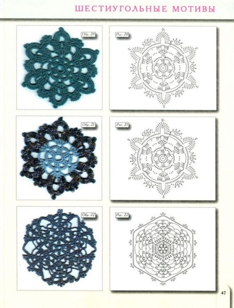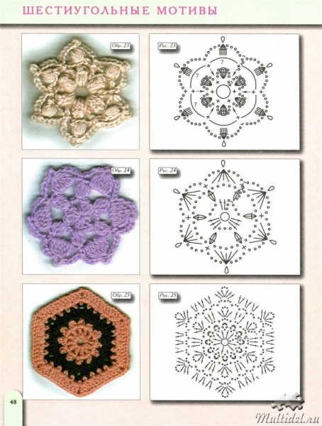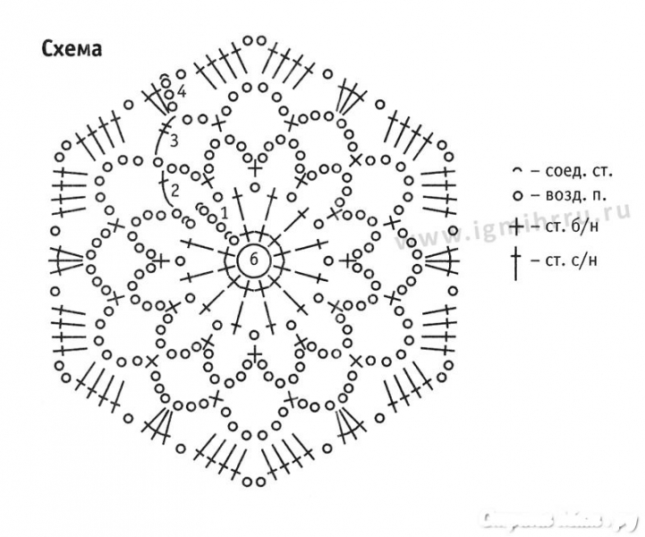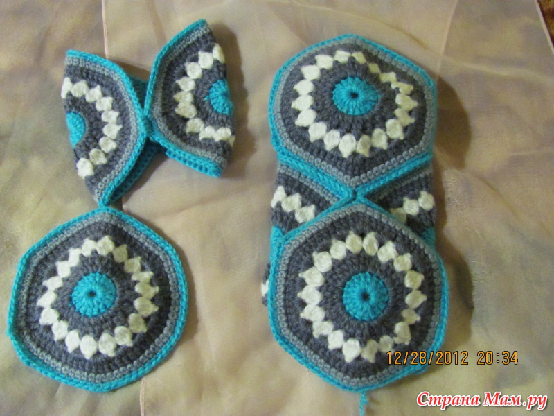 Мотивы в виде шестиугольников вяжем по схемам, начиная с цепочки из 3-6 ВП. Чаще всего, в изготовлении одного элемента используется несколько цветов пряжи. Размер каждого из шестиугольников рассчитывается за раннее, исходя из размера стопы и количества элементов в сапожках. Например, если обувь состоит из 6 мотивов, то для определения его размера измеряем длину стопы (расстояние от большого пальца до пятки), результат делим на 2 и прибавляем 1 см. Так, для стопы 24 см, диагональ мотива будет равна 24/2+1 = 13 см
