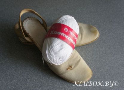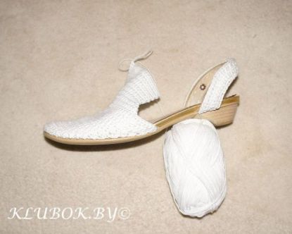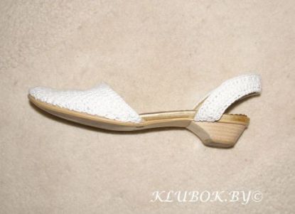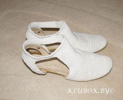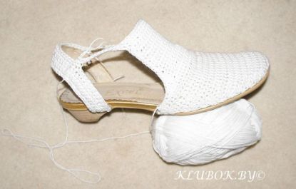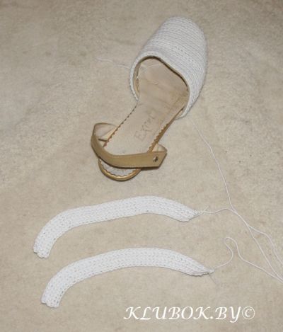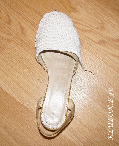 Вяжем сначала накладки на носок босоножек столбиками без накида. Убавку выполняем, прикладывая вязание к обуви. Лучше в первом ряду убавить 2 петли, а в последующих по 1 петле.