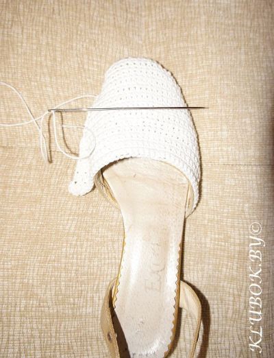 Длинной иглой пришиваем задник к обуви, края пряжи завязываем в узелки и прячем внутрь. Прихватываем бесцветным клеем
