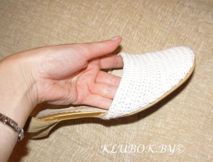Для лучшего прилегания вязанной части к балетке, нужно последний ряд в районе носка сложить пополам и провязать ССН за бока.