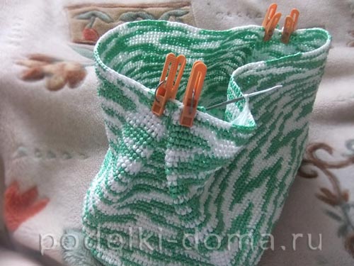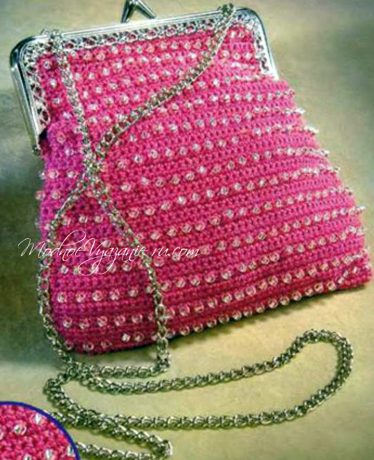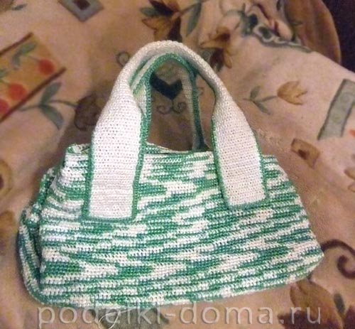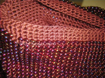 Основной узор – СБН. Нанизываем бисер на нить и размещаем в изнаночном ряду. Если сумочка будет вся покрыта бисером, то его количество необходимо утроить и вязать в каждом ряду, в каждой петле.