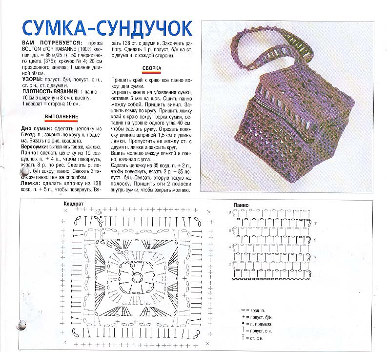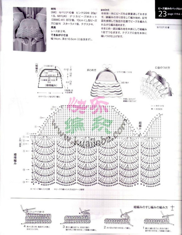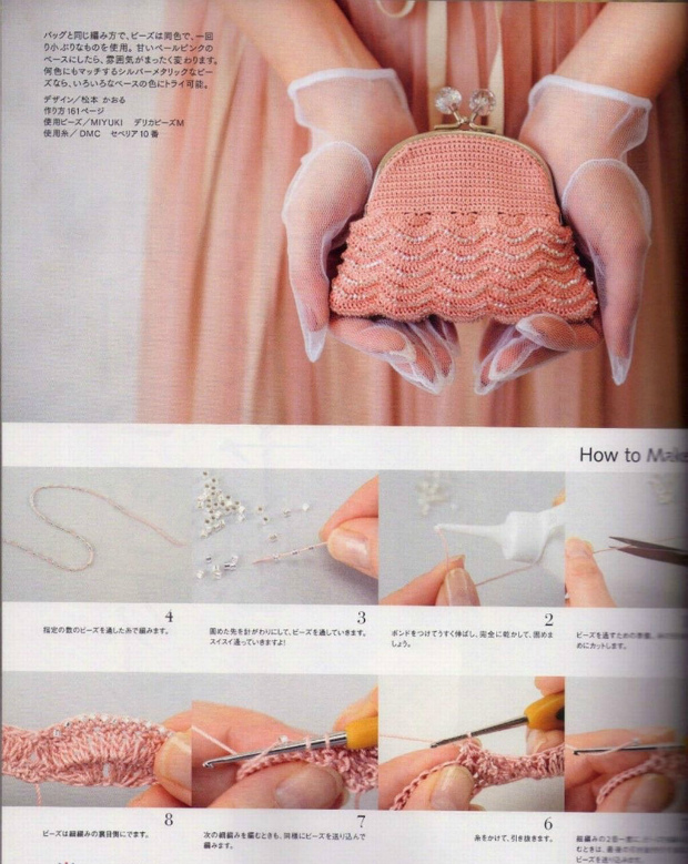 Рассмотрим, ещё один вариант выполнения этой модели. Его мы взяли из японских журналов. Описание на русском языке отсутствует, но есть подробные схемы и пошаговые фото. Сумочка, украшенная бисером миниатюрная и выглядит очень изысканно