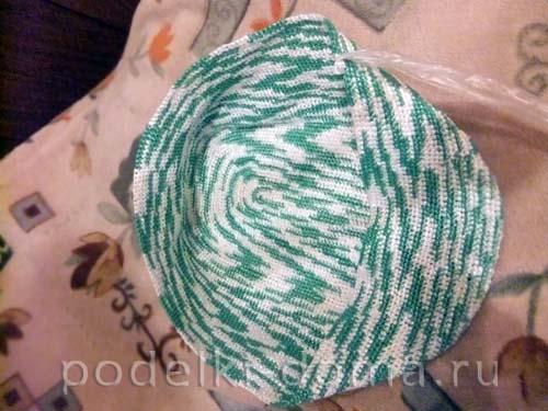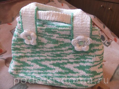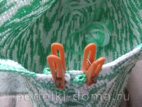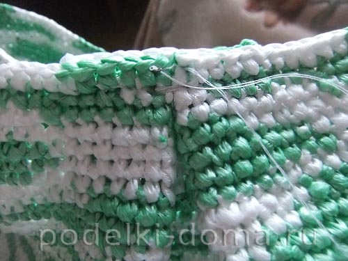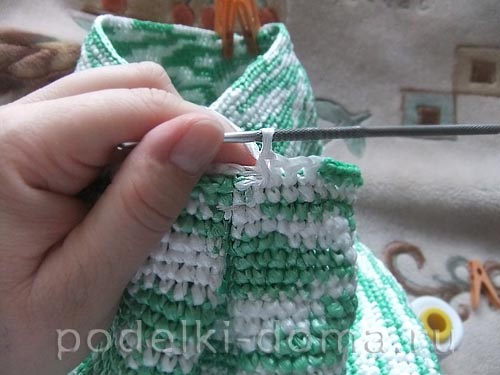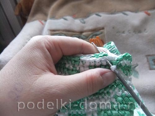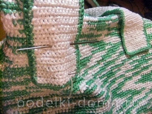 Ручки вяжем из белых пакетов, а края обвязываем 1 рядом из зеленых