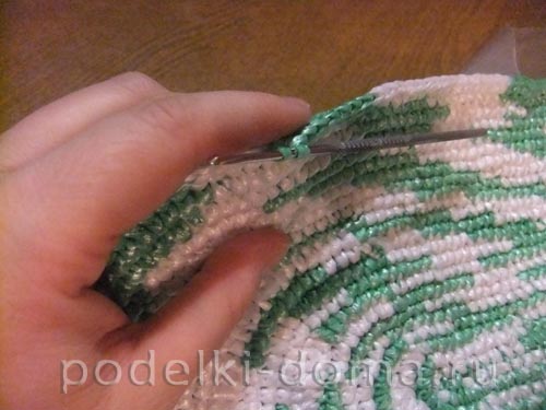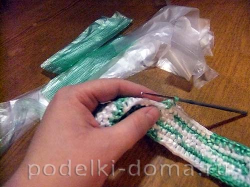 Делаем пряжу из пакетов. Режем их на полоски, после чего соединяем их в нить. Одна полоска представляет собой кольцо. Чтобы соединить её со второй, необходимо край одной полоски подложить под край другой, а затем продернуть в петельку. В данной модели на две белые нити приходится одна зеленая.