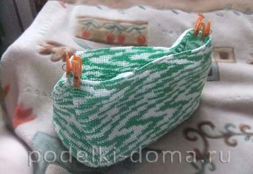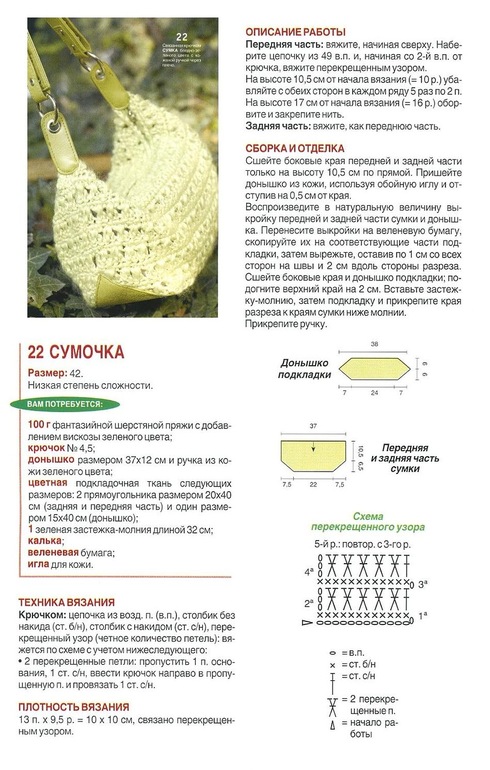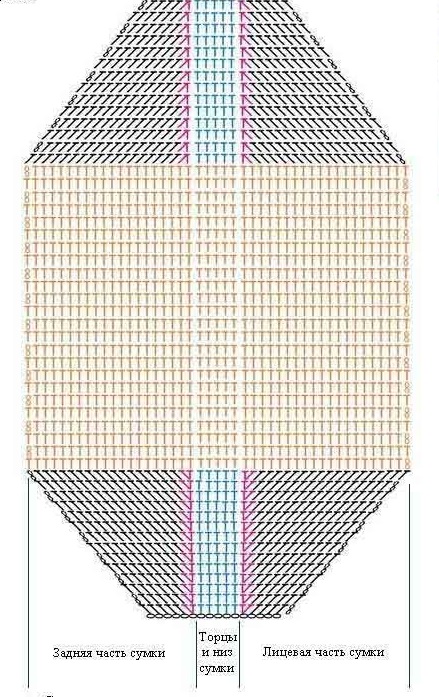 Чтобы не ошибиться с размерами сумочки, необходимо вырезать макет из ненужной ткани, сметать складки и пришить к сумке. Вязание выполнять в соответствии со схемами, в поперечном направлении, ориентируясь на макет.