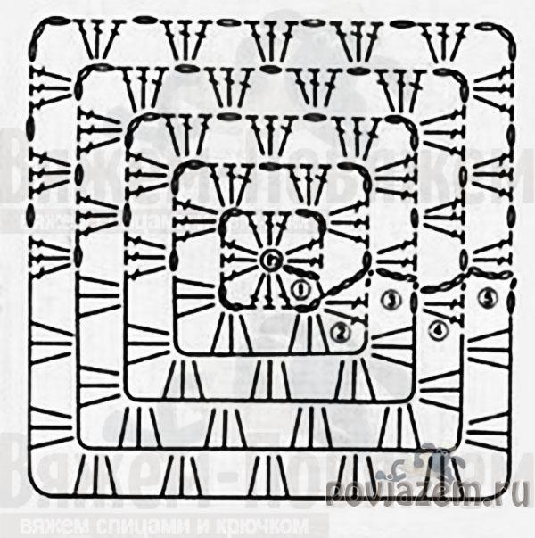 Сначала нам необходимо связать 8 бабушкиных квадратов, схема которых представлена ниже. Каждый из них начинается со скользящей петли и состоит из 6 рядов.