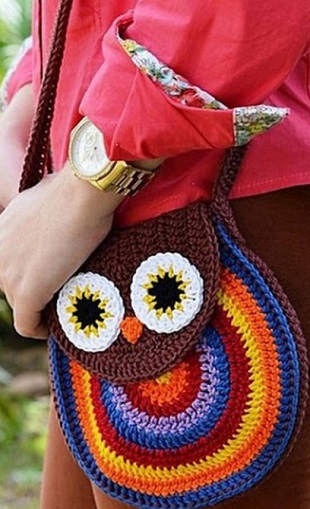 Сова сейчас очень модный персонаж, символ мудрости. Её изображением украшают шапки, шарфы, свитера. Рассмотрим, как связать пёструю сумочку в форме этой птицы. Схема не простая, может вызвать сложности у начинающих, но, я считаю, всё же стоит попробовать