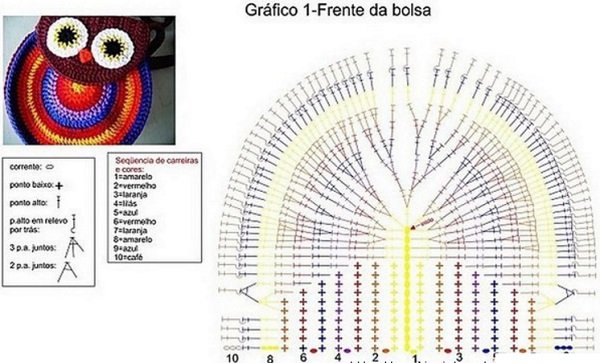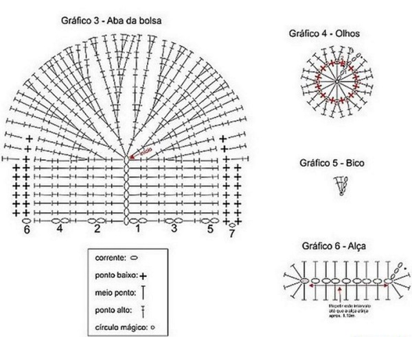 Вязание будем выполнять по кругу, следуя схемам. Сумка состоит из двух основных деталей – передней и задней стенки. Глаза и клюв вяжем отдельно, а затем пришиваем к основному изделию.