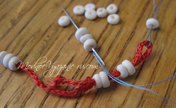 Как будем размещать бисер. Вытягиваем петлю и сдвигаем к ней бисерину на крючке. Делаем накид и протягиваем нить через две петли.