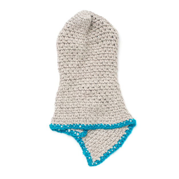 - 1 р.: п. с. с н. по низу капора, не стягивая его краешек (у нас получилось 42 п., однако точное число петель не имеет особого значения). Когда мы дойдем до противоположного угла, набираем цепь из 20 в. п. (по желанию, количество в. п. можно уменьшить до 10-15, поэтому рекомендуем примерять капор во время вязания).