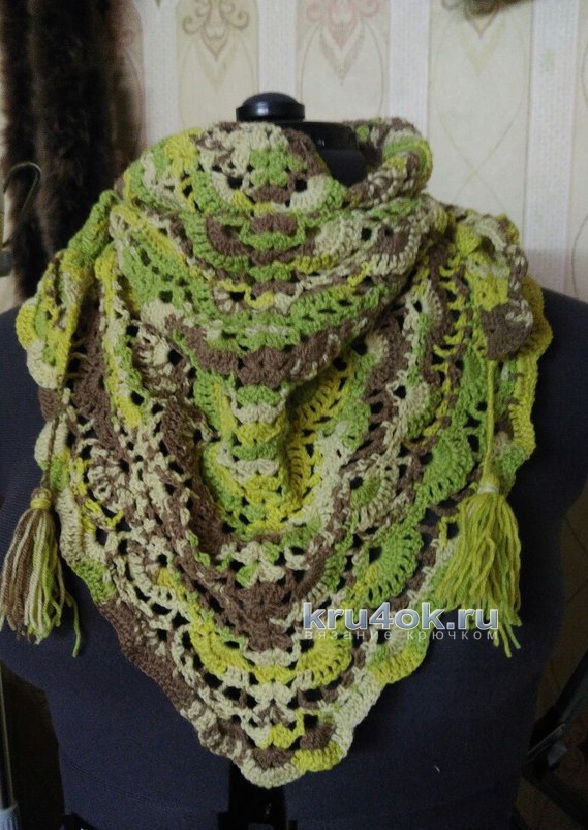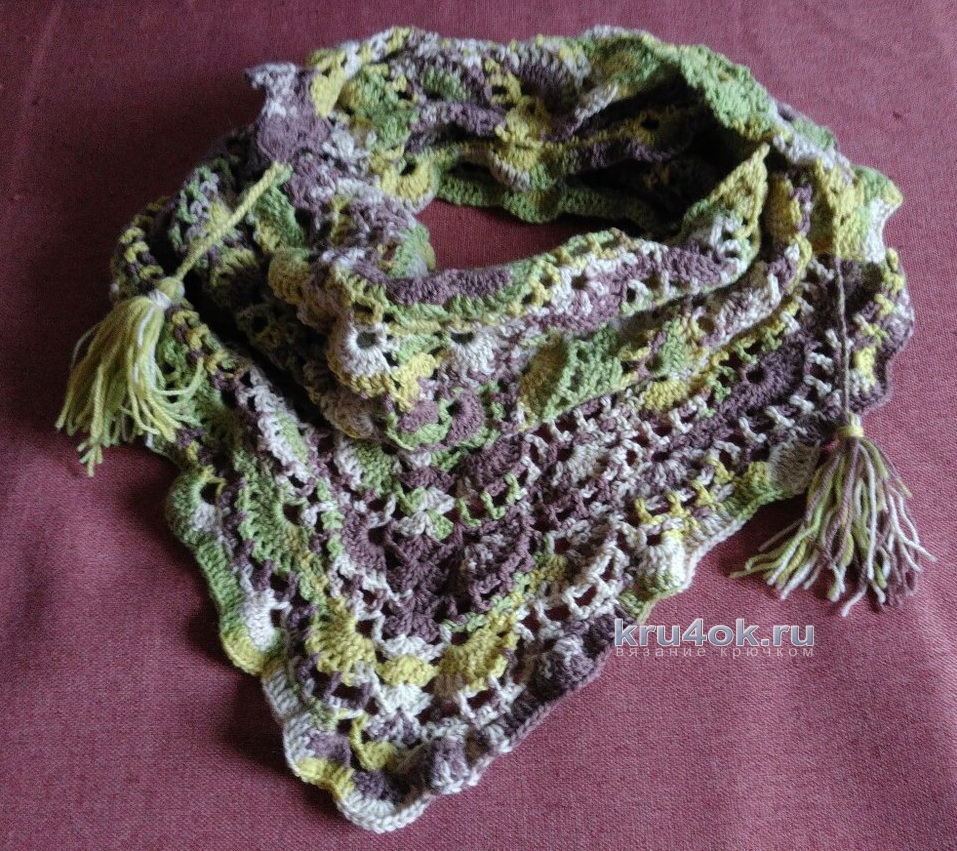Красивый ажурный платок выполненный в зелёно-фиолетовых тонах прекрасно дополнит образ как осенью, так и весной.