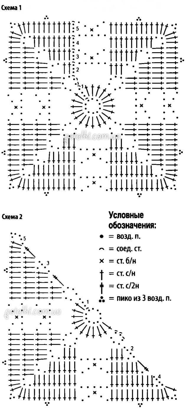 Вяжем 36 квадратных мотивов, как показывает схема 1 и 9 треугольных по схеме 2. Соединяем элементы в ходе вязания за арку из 3 ВП.