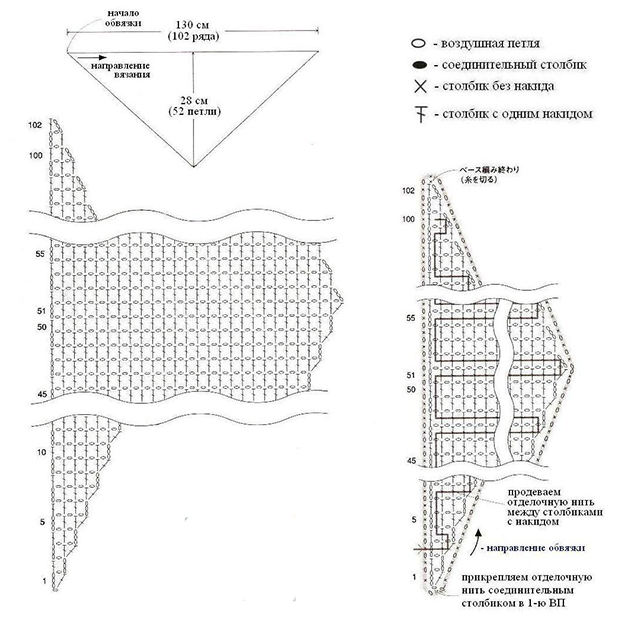 Как выполнять сам платок и его обвязку подскажут следующие схемы
