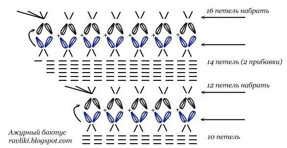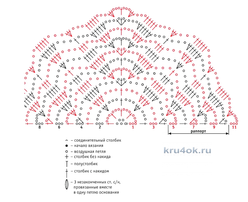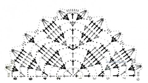 Начинаем вязать аксессуар с петли 1 по схеме ниже. Чередуем в рядах тройные петли с ССН, при этом каждые 2 ряда увеличиваем ширину изделия на 1 пет. Делаем это до тех пор, пока ширина полотна не достигнет 51 петли или 28 см. Затем приступаем к убавлению. Его выполняем также, как и прибавку – 1 петля на 2 ряда.