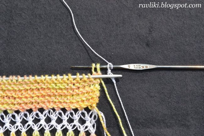 Подхватываем тонкую нить и протягиваем её через 2 последующие, снятые со спицы через заднюю стенку.