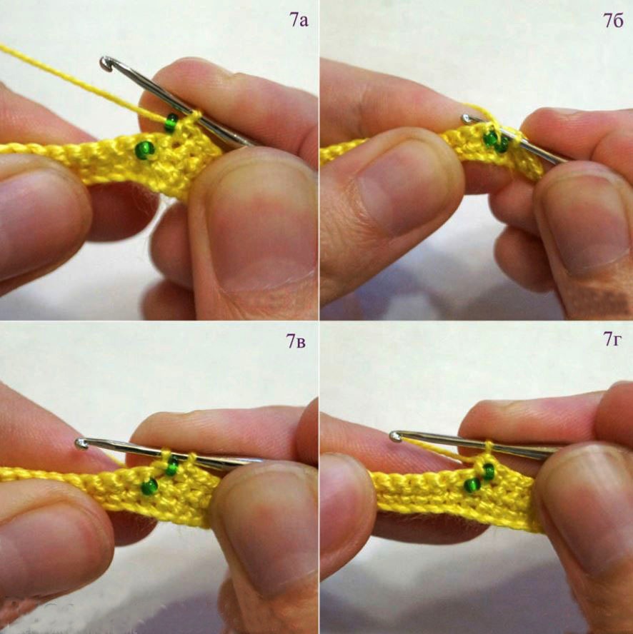 Перемещаем бусинку вплотную к петлям (ф.7а). Заводим крючок в ближайший стлб предыд. р., при этом бусинка должна оказаться перед работой (ф.7б). Захватив нитку за бусинкой, вытягиваем новую петельку (ф.7в). Еще раз захватив нитку, протаскиваем ее через две петельки (ф.7г).