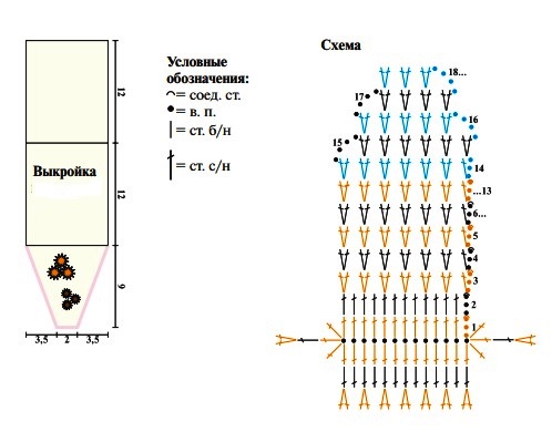 Дальнейшую работу выполняем по схеме вкруговую по 14-ый рядок включительно. Каждый р. завершаем ССт. Далее полотно разделяем на две части пополам. Клапан вяжем прямыми/обратными рядками по сх. с 13р. по 22р. Нить обрезаем.