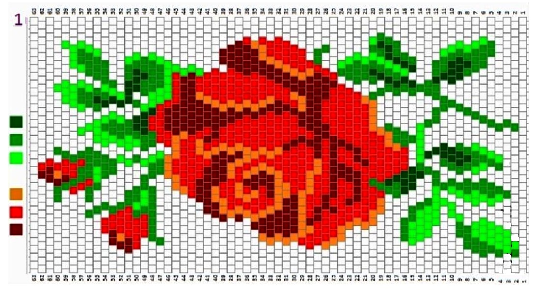 Выполняется в обратном вязке порядке, сверху вниз. Начинаем с 63-го р., заканчиваем 1-ым. Для нечетных рядков набор бисера по схеме делаем слева направо, для четных – справа налево. Более подробно: