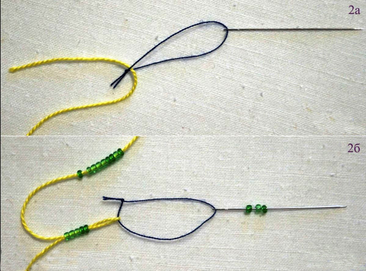 А можно попытаться облегчить себе работу. Для этого в тонкую иглу вдеваем обычную нить для шитья длиной около 6см. Делаем петельку, завязав узел. В нее продеваем рабочую нитку – см. фото ниже. Бисер, нанизанный на иглу, пройдя обычную нить, перейдет на рабочую (ф.2а, 2б).